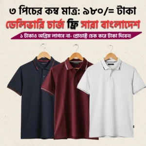 প্রিমিয়াম চায়না পিকে কাপড়ে তৈরি স্টাইলিশ ৩ পিস পোলো শার্ট। নরম, আরামদায়ক ও টেকসই ফেব্রিক—গরমে ঘাম কম ধরে, রং ফেইড হয় না এবং সেলাই মজবুত।