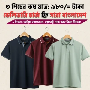 প্রিমিয়াম চায়না পিকে কাপড়ে তৈরি স্টাইলিশ ৩ পিস পোলো শার্ট। নরম, আরামদায়ক ও টেকসই ফেব্রিক—গরমে ঘাম কম ধরে, রং ফেইড হয় না এবং সেলাই মজবুত।